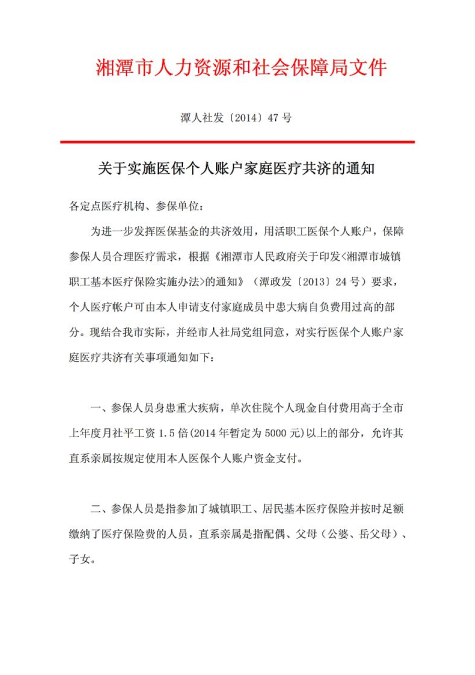 關(guān)于實(shí)施醫保個(gè)人賬戶(hù)家庭醫療共濟的通知